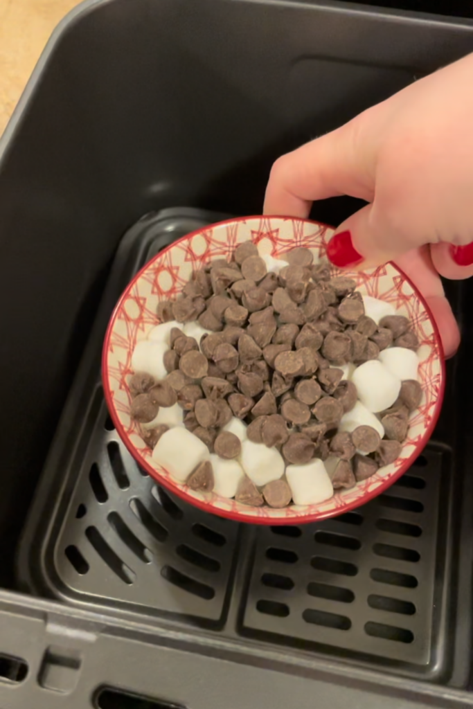 - Place bowl in air fryer, and cook at temperature 350 degrees (180 degrees Celsius) for 4-5 minutes (until your chocolate chips are melted and your marshmallows are browned)